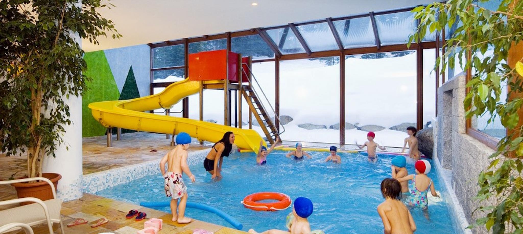 Cosa c'è di più bello se fuori nevica o piove di giocare insieme agli amici in uno spazio esclusivo e sicuro? Per i più piccoli abbiamo dedicato un'intera piscina affacciata sul bosco con grandi vetrate e un fantastico superscivolo per vivere la vacanza più allegra di sempre.